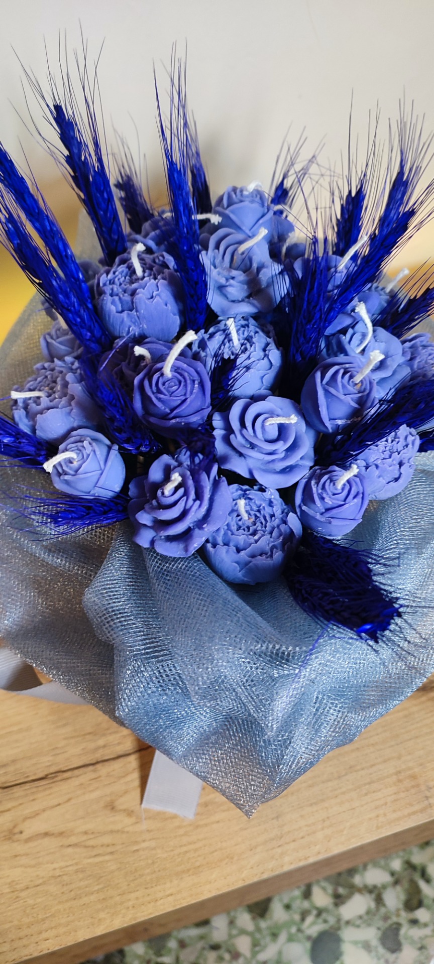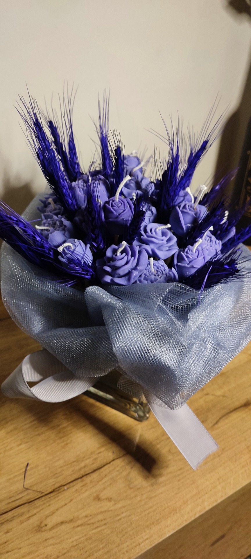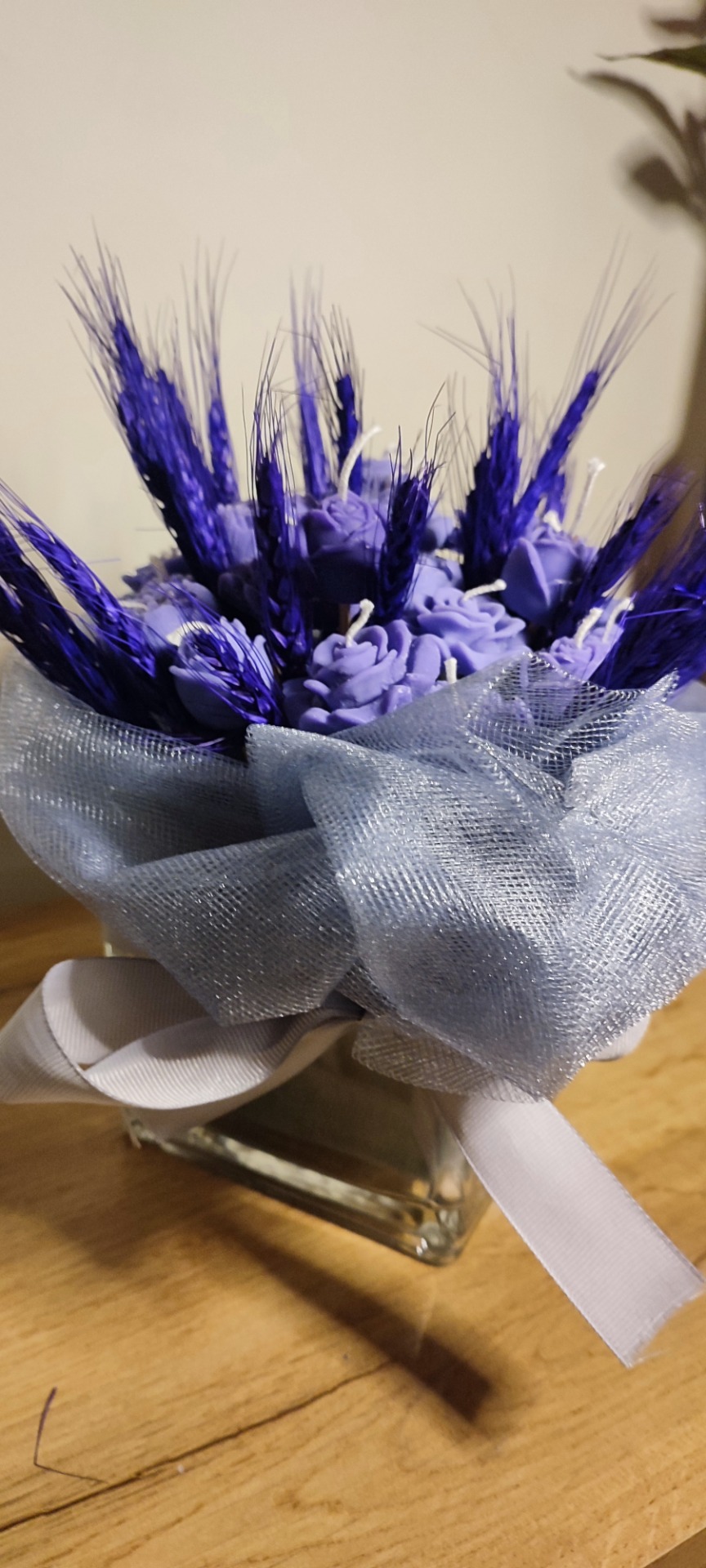 Ένα ξεχωριστό μπουκέτο από χειροποίητα κεριά σε αποχρώσεις του μωβ, στολισμένο με σκούρα στάχυα για μια φυσική, αριστοκρατική πινελιά!